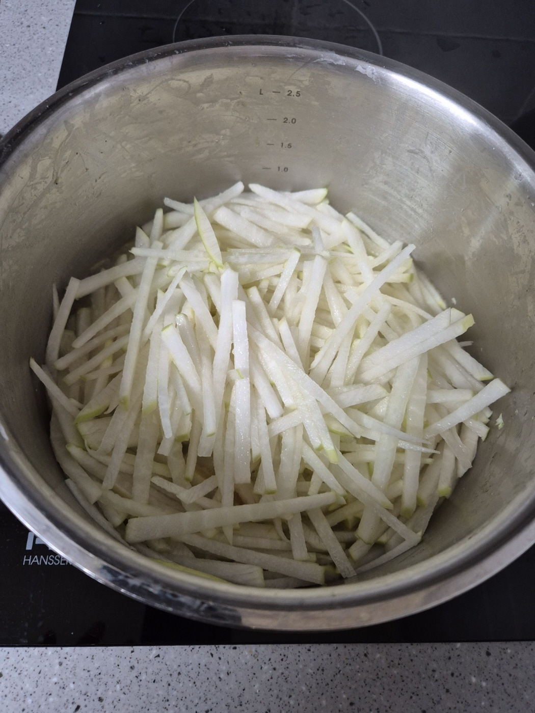 1. 무를 생채 할 때 보다 조금 굵게 채썰기 (너무 얇으면 무가 부서짐)