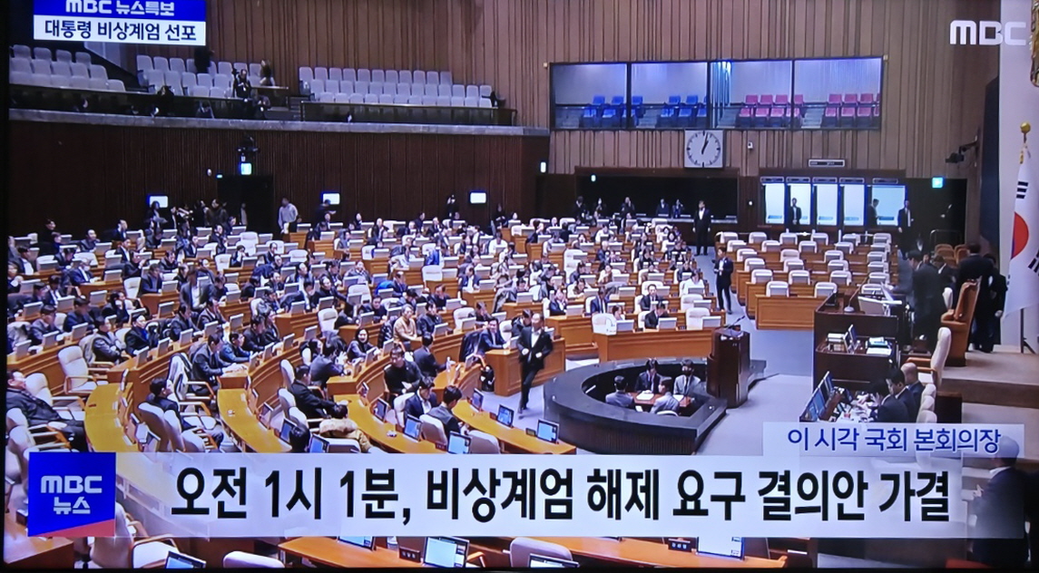 국회는 불법 계엄령 즉각 해제하라고 결의하고 따르지 않으면 그 자체도 불법이라고 선언하기도 하였다