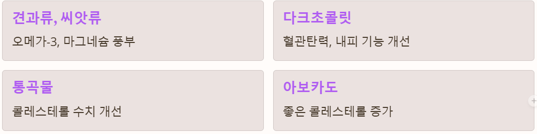 아보카도: 단일 불포화 지방이 풍부하며 나쁜 콜레스테롤(LDL)을 낮추고 좋은 콜레스테롤(HDL)을 높여 혈관건강에 도움을 줍니다