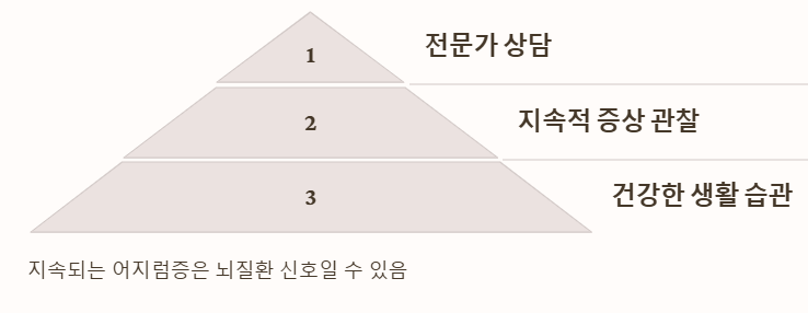 짧게 오는 현기증이나 어지럼증이 지속된다면 뇌질환의 문제일 수 있으므로 조기 발견을 위해서라도 꼭 전문가를 찾아가는 것이 중요한 것 같습니다