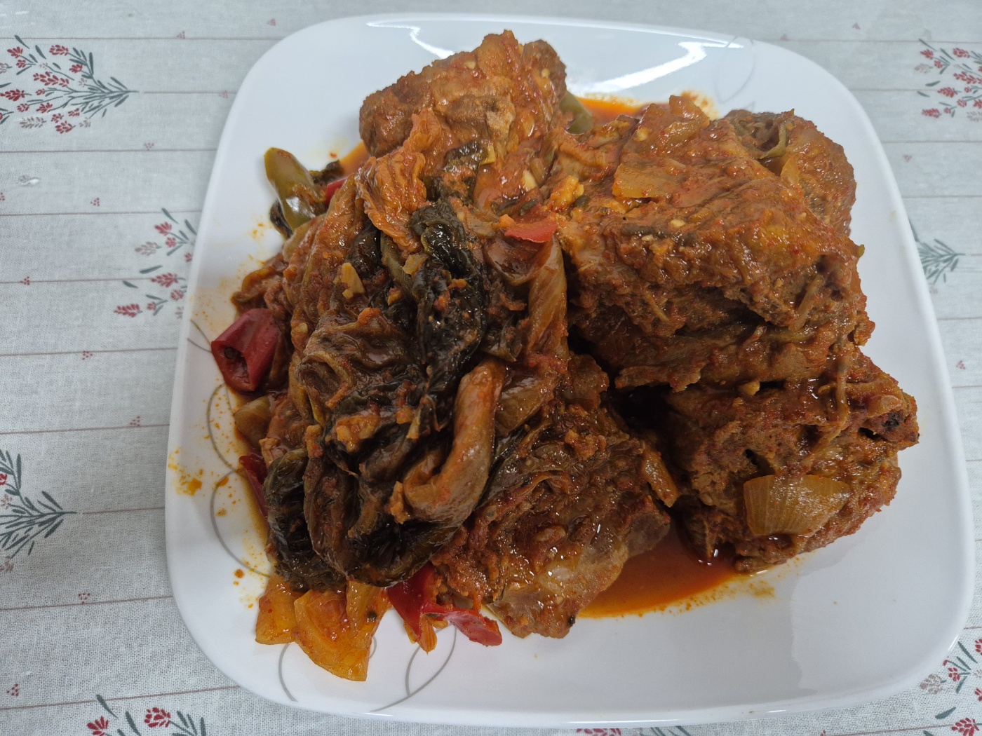 돼지등뼈 2kg, 묵은지 반포기, 고추 3개 정도, 마늘 3숟가락(밥숟가락), 대파 2개, 양파 1개, 된장 2숟가락, 매실 2숟가락, 조선간장이나 액젓 2숟가락, 고추장 2숟가락, 고춧가루 3숟가락
