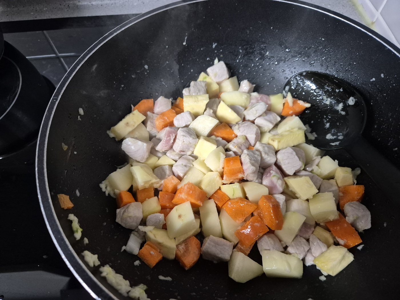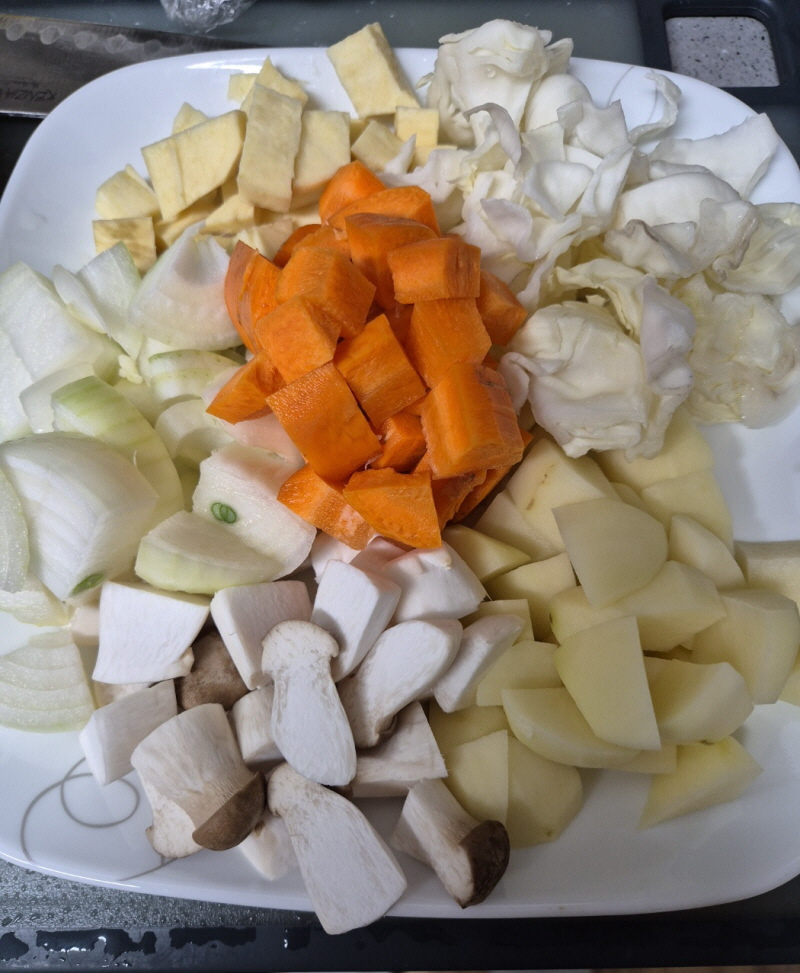 돼지고기 200g 정도, 다진 마늘 1숟가락 , 큰 양파 반 개, 버섯, 호박, 당근, 양배추, 감자, 고구마, 식용유, 마트에 파는 짜장가루 1 봉지