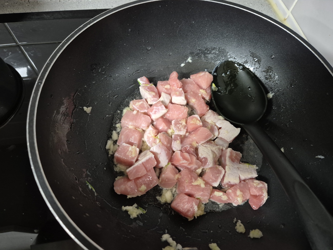 3. 냄비에 식용유 4숟가락(밥숟가락) 정도를 두르고 마늘과 자른 돼지고기를 넣고 겉이 익을 때까지 볶아준다