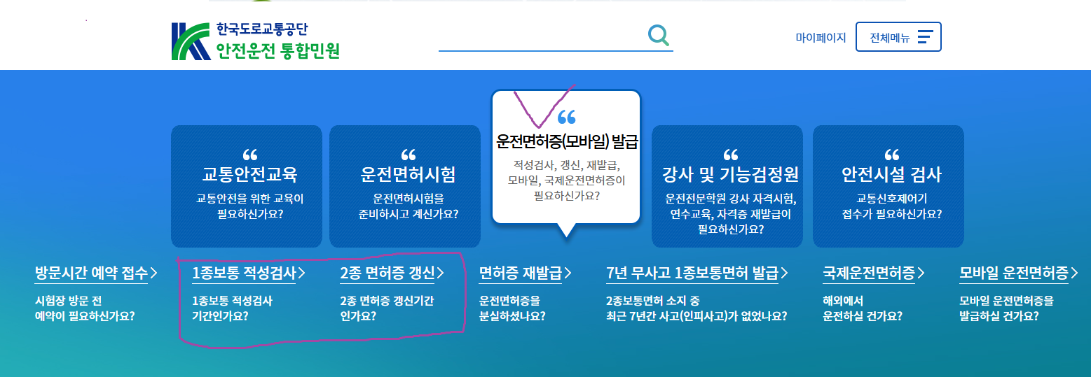 • 홈페이지 접속 → 면허 종류 선택 → 절차 진행